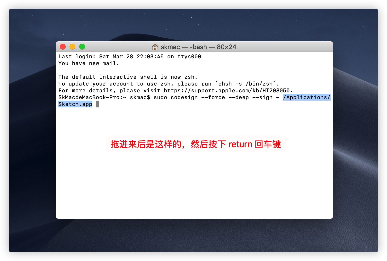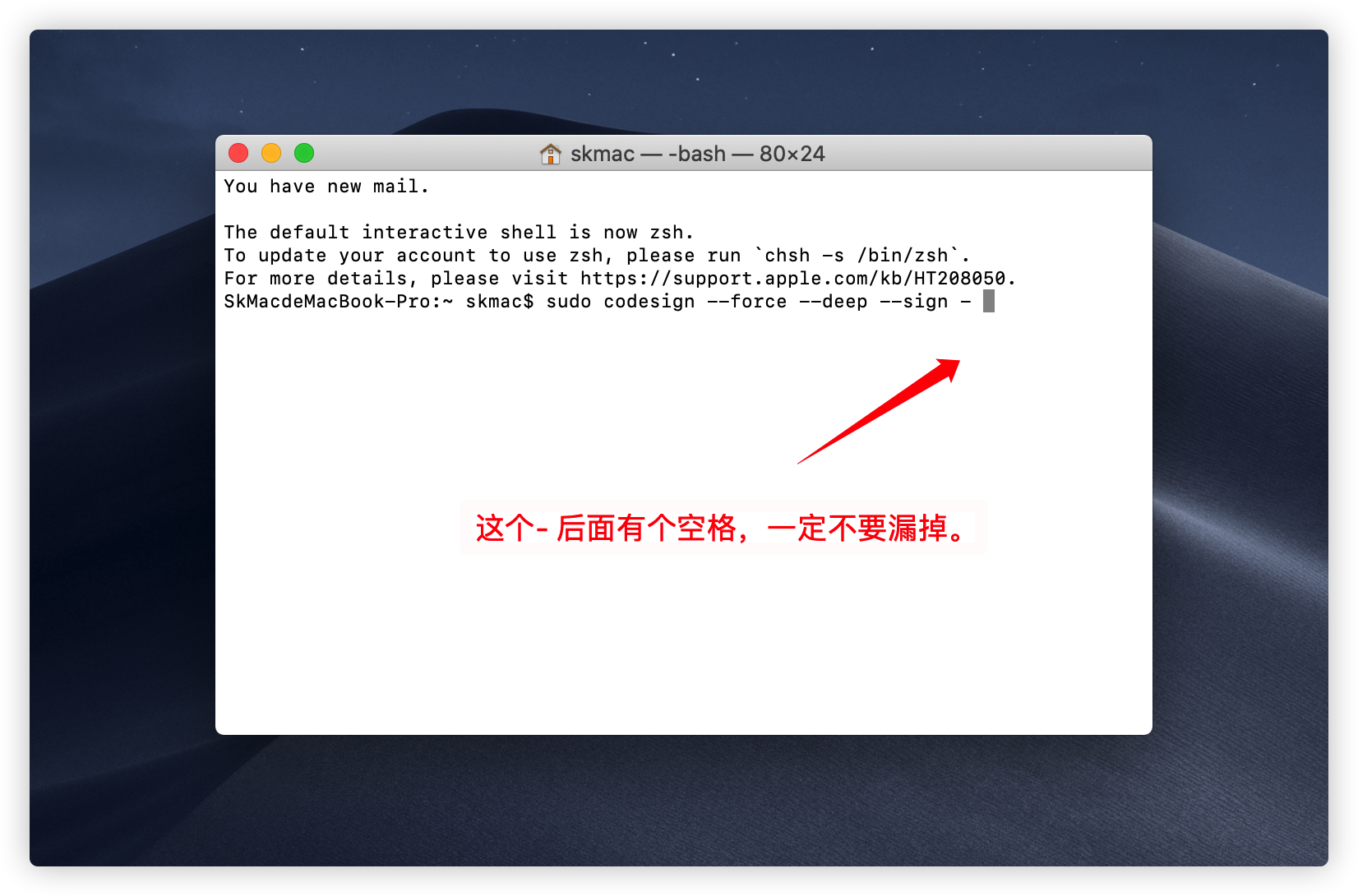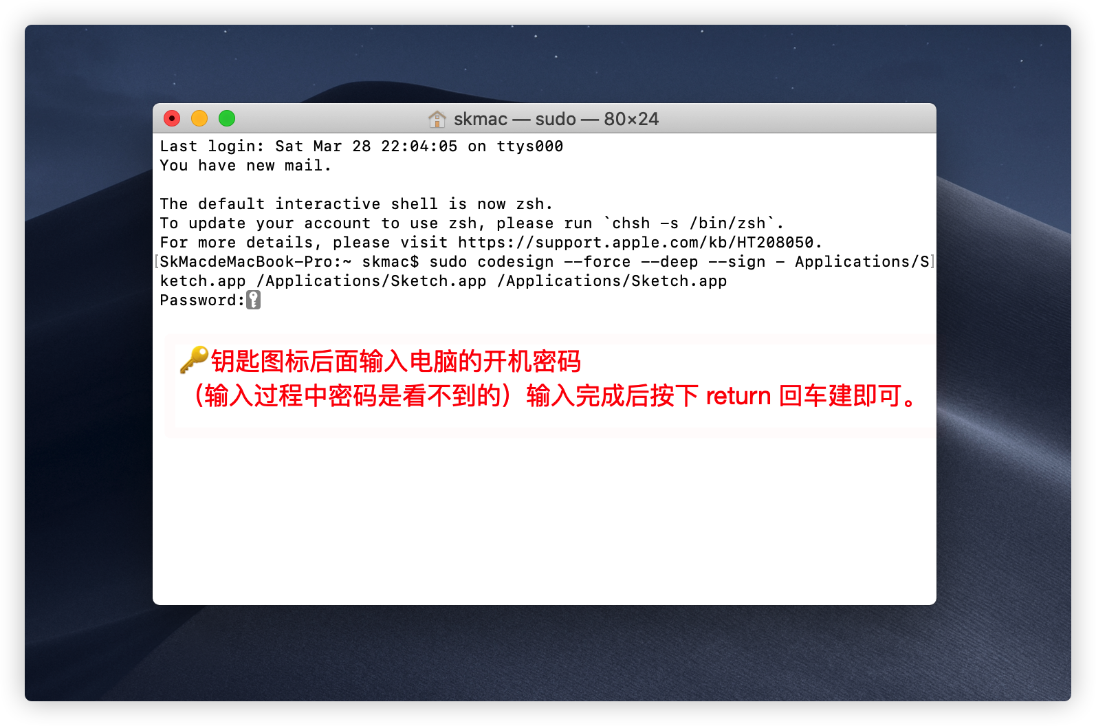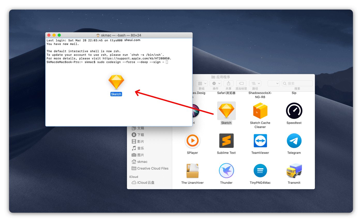 sudo codesign --force --deep --sign - (应用路径)应用路径:打开访达(Finder),点击左侧导航栏的 应用程序,找到相关应用,将它拖进终端命令-的后面,然后按下回车即可,注意最后一个 - 后面有一个空格。