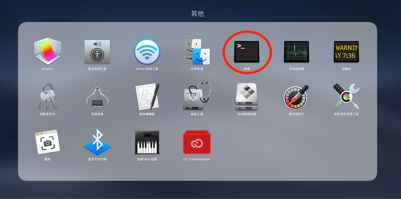 打开终端输入以下命令并回车(可以通过点击屏幕右上角的搜索图标,输入
