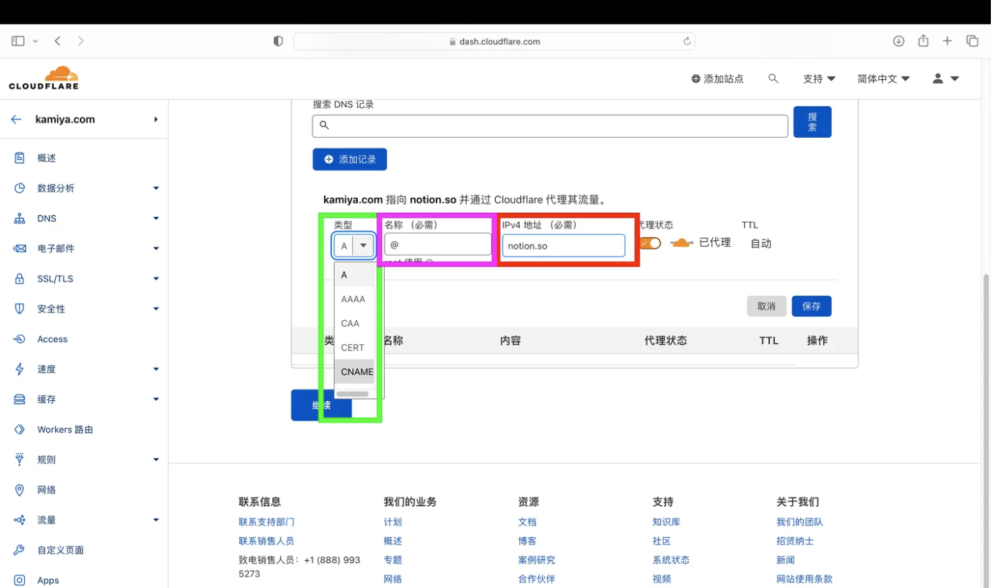 - 类别选择“CNAME”,IPv4地址固定填写“notion.so”