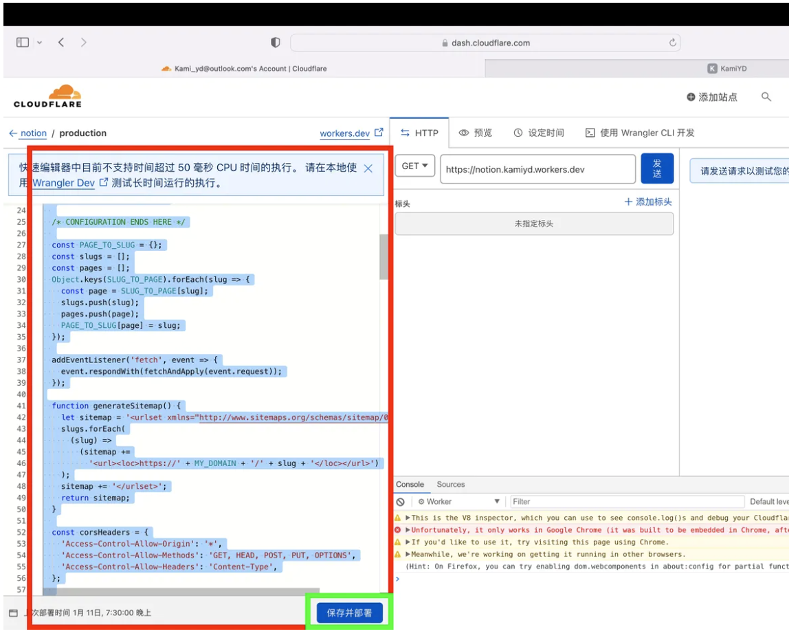 左侧代码区块,Ctrl+A全选删除,刚才复制好的代码Ctrl+V粘贴,然后点击“保存并部署”