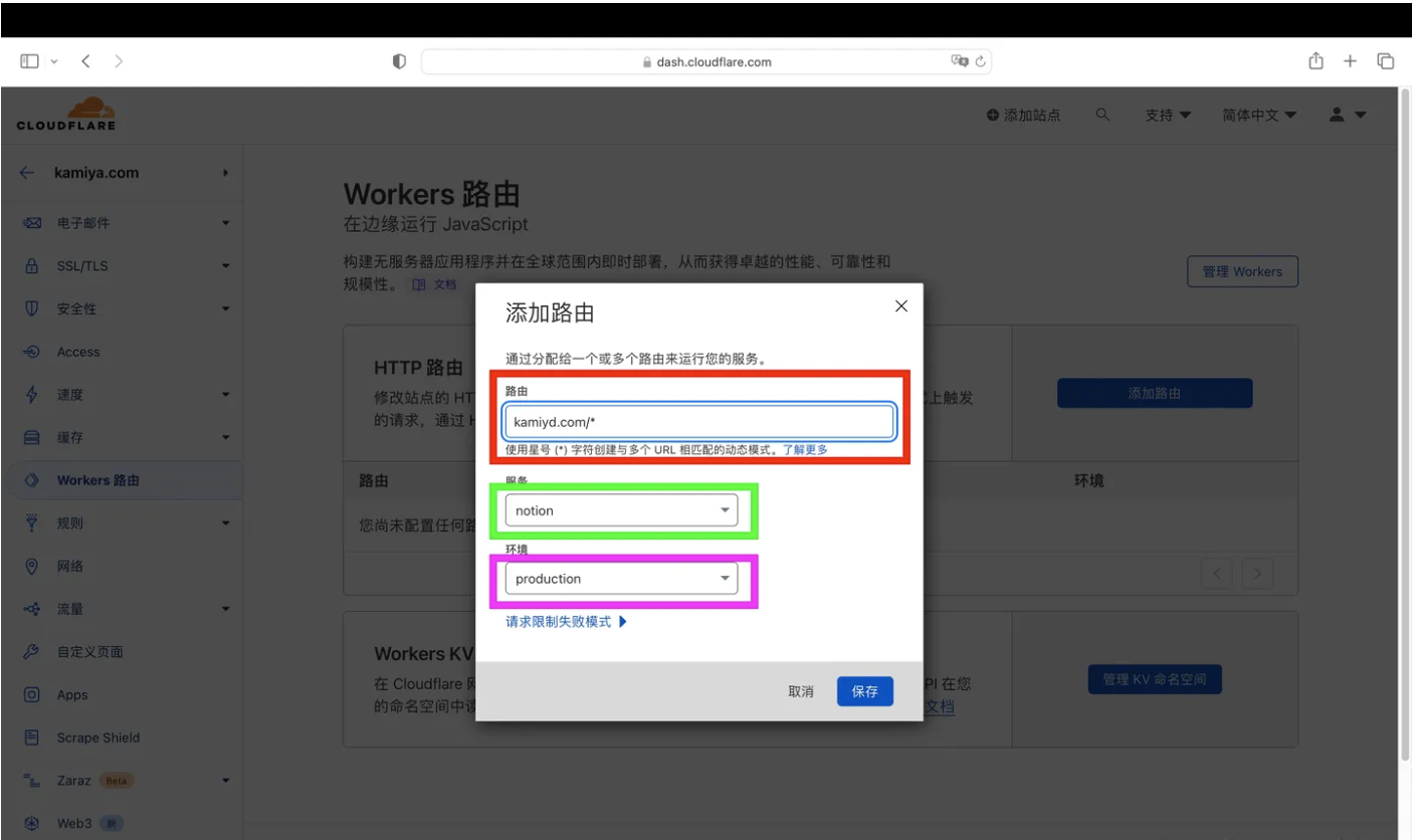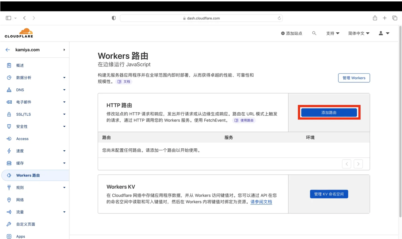 - 点击“Workers路由”,点击“添加路由”